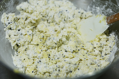 加入面粉和熟黑芝麻,换成刮刀按压拌匀;