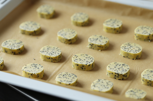 烤箱预热170℃,取出冷藏后的饼干面胚,切成0.8cm厚度的饼干;
