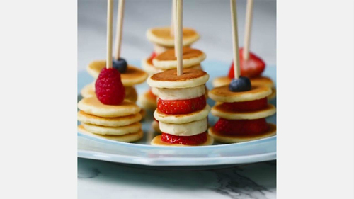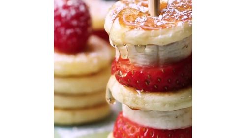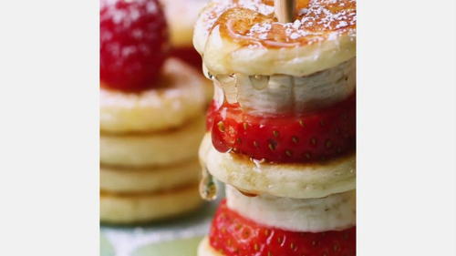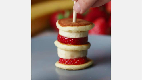 松饼煎完后,将松饼,草莓,香蕉从下至上串起来,也可以根据个人喜好随意组合;