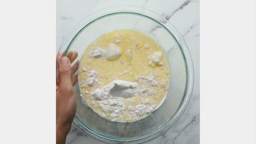 往牛奶中加入鸡蛋,黄油,搅拌均匀,再倒入混合粉类中;