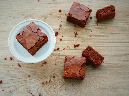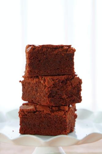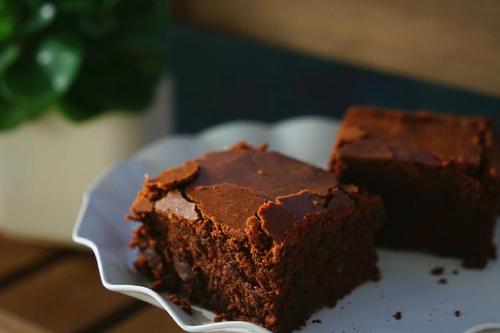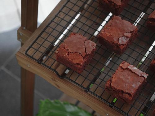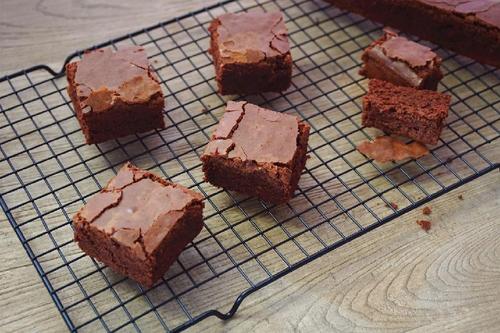 拎着油纸把蛋糕整个脱模出来,正面朝上晾凉,然后切块吃起来~这是刚烤好当天的样子;(注意:刚烤好的蛋糕非常柔软,非常难切好。建议放到室温后再切。如果布朗尼中添加了坚果等材料也会增加整齐切块的难度,可以彻底冷藏,让布朗尼变硬后再切块)。