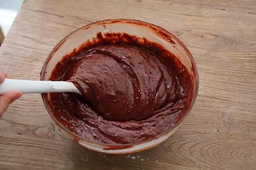 加入融化的巧克力黄油混合物,搅拌均匀。这一步需要保证巧克力黄油混合物的温度在60度以下,以免烫熟鸡蛋。