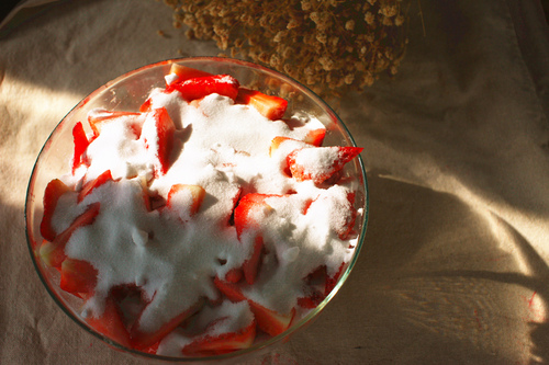 将准备好的白糖与草莓混合均匀;因为白糖撒上之后,草莓之间的粘度会变得非常之高,所以一定要使劲儿的搅拌!白糖不仅有调味的作用,更主要是防腐,所以不能放太少;搅拌均匀后封上保鲜膜放入冰箱冷藏先腌一会儿,建议3-4个小时就好;