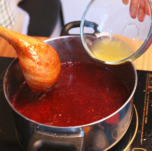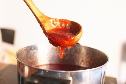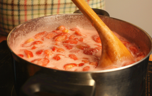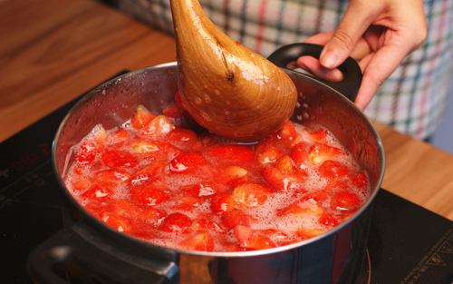 冷藏之后拿出,连同草莓溢出的汁水一起倒入锅中;大火烧开,小火慢熬;中间记得要不停的搅拌,且火不要太大,不然你的果酱会溅的到处都是。大概要熬1个半小时。