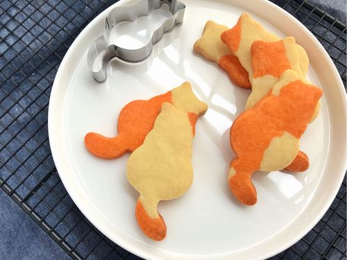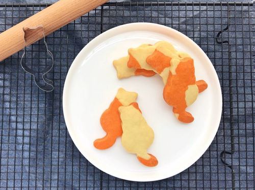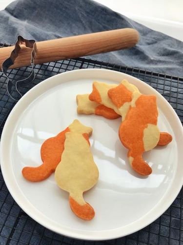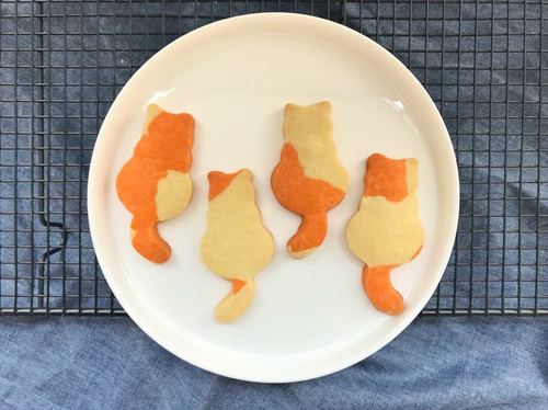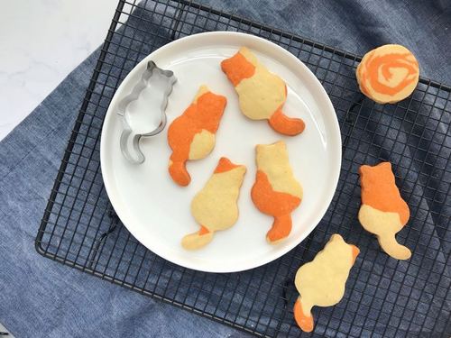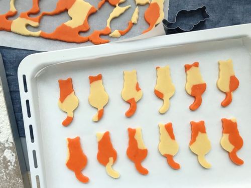 扣好的饼干坯放在室温下充分回温,然后放入预热150度的烤箱中层,烤18-20分钟。看到饼干膨胀充分、表面微微上色即可出炉晾凉。做猫饼多余的边角料面团也可以揉到一起,整形切片烤成大理石曲奇,同样好吃,什么都不影响!