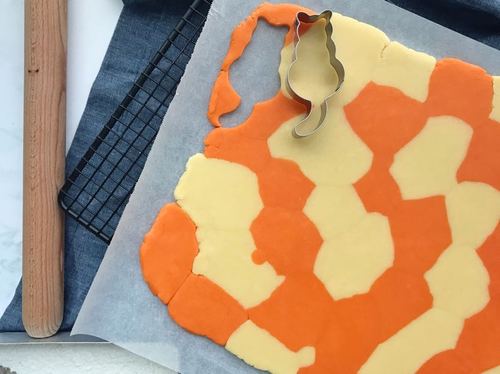 将面团至少冷藏1小时,然后取出随意分成小块。交替摆放后擀成7mm厚片,用模具扣出形状,摆在垫好油纸的烤盘里。冬天气温低,最适合做这步了,如果其它季节温度太高、面团发软,就中途冷藏一会儿,等面团有硬度了再继续操作。