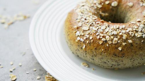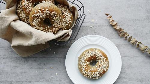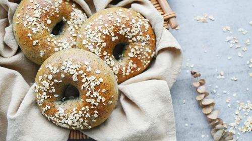 烤好的贝果表面略带金黄光泽,组织饱满松软,吃起来嚼劲适中,麦香混着淡淡的芝麻味,加上表皮香脆的燕麦粒,带来层次丰富的香甜口感。