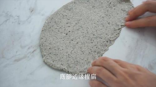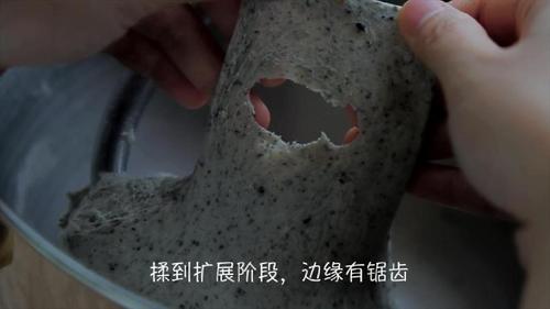 将高粉、黑芝麻粉、盐和白砂糖混合均匀,然后加入酵母、玉米油和冰水,揉面至拓展阶段(能拉出不太厚的膜,破洞边缘粗糙)即可;