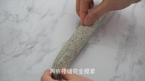 先将面团两端捏紧,然后将所有接缝捏紧,搓成25CM左右的长条;