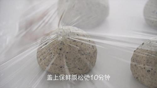 将面团平均分割成6个面团,大约每个87g。逐个滚圆成团,盖保鲜膜松弛10分钟左右,至手指轻按表面完全不回弹的状态;