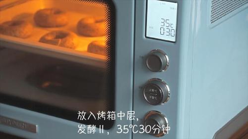 发酵盘盛上温水放入烤箱底部,贝果面团放入烤箱中层,启用发酵Ⅱ功能,35度发酵30分钟,至面团发酵为约2倍大即可;