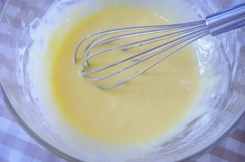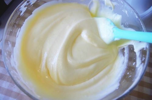 打发好的蛋白与蛋黄面糊分次混匀,装入模具后开始烘烤,30到35分钟