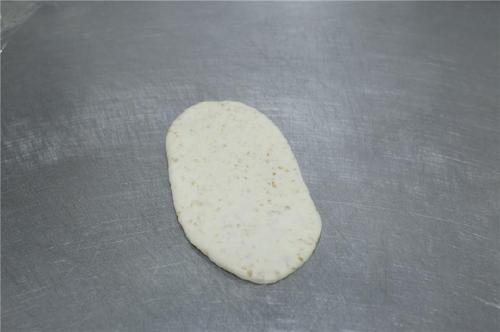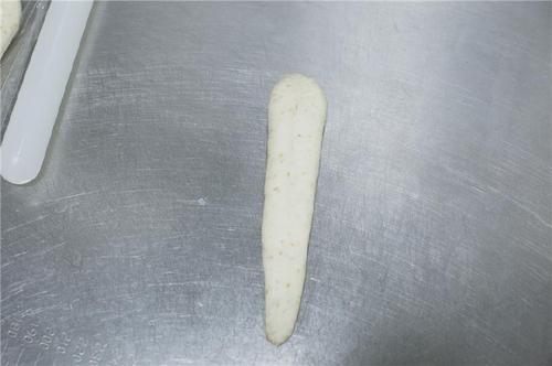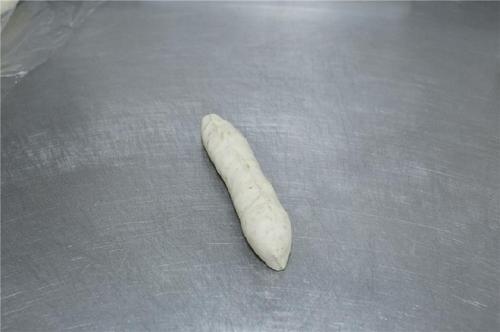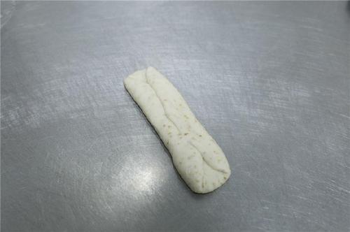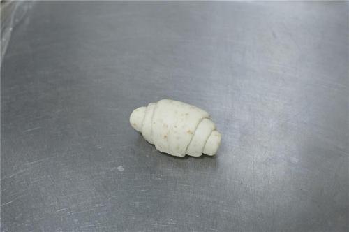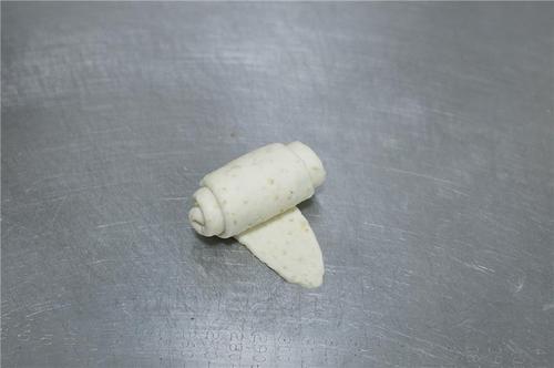 取一个小面团按扁,擀成长条形;将左右两边往中间折,再合起来捏紧。
