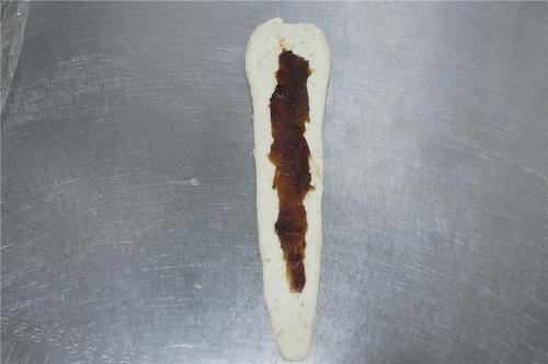 将面团轻轻按扁、擀长,抹上少许红豆沙;(注意底部不要涂抹)