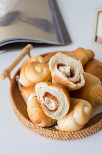 将高筋面粉、全麦面粉、耐高糖酵母、奶粉、细砂糖、盐、水、等材料混合,揉至扩展阶段;再加入黄油揉至完全阶段;