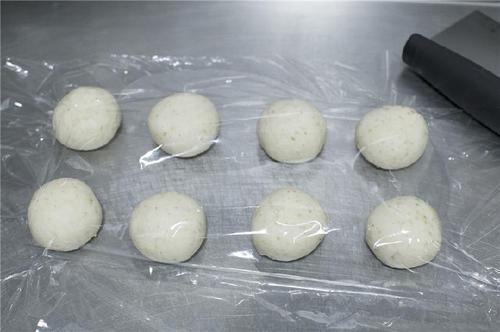 将发酵好的面团等分成8等份,滚圆,盖上保鲜膜或者湿布醒发15分钟;