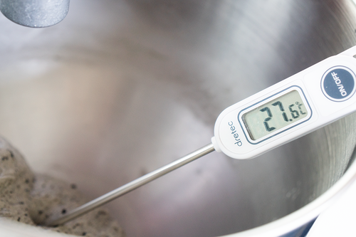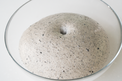 面团整圆,放入涂油的容器,盖保鲜膜28℃进行一发;大约40-50分钟,手指蘸面粉在面团表面戳洞,没有明显回缩即可;