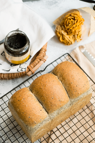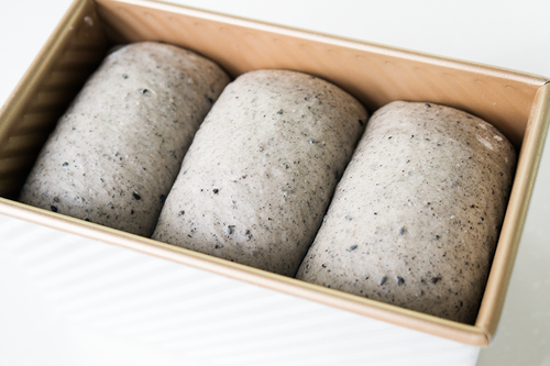 第二次擀长,表面涂抹黑芝麻酱后,卷起放入吐司模中,35℃二发约45分钟,面团涨至模具8分满,此时如果手指沾面粉轻碰表面,不太回弹但仍有张力即可;取出后烤箱下层放烤架,预热190℃;