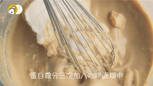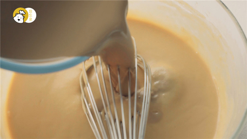 冲泡好的咖啡与温牛奶B混合均匀,分三次加入蛋黄糊中;最后一次加完后,原本的蛋黄糊已经变成稀薄的水状,这是正常的;