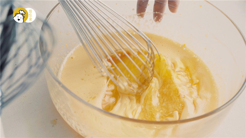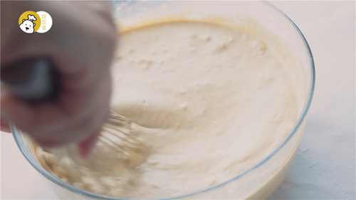 将蛋白霜分3次,混入稀薄的面糊中,用打蛋棒画Z字形混合即可,最后变成厚厚一层蛋糊漂浮在液体上的状态;