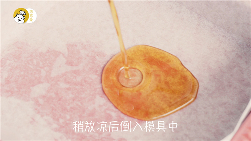 细砂糖倒入小不沾锅,中小火加热至变为焦糖色,奶锅离火后立刻将准备好的热水倒入焦糖液中。水分猛烈沸腾后,锅中剩下的略稀的就是焦糖液。焦糖液稍微放凉至不烫手后倒入模具内的油纸上备用;
