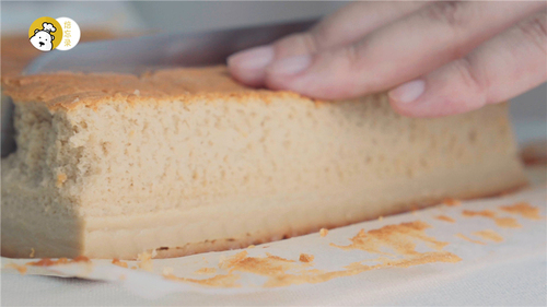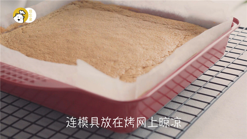 烤好之后立刻取出蛋糕,轻磕一下,震出热气,连模具放在烤网上晾凉至不烫手后再提住两侧油纸,将整块蛋糕拿出;撕开四边的油纸,再彻底晾凉、散去水汽;