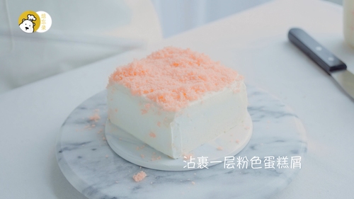 冷藏好的慕斯可以借助喷枪脱模,取少量奶油打至8分发,用来涂抹整个蛋糕的表面(也可以不打奶油,直接用剩余的慕斯糊);这一层奶油是为了方便沾蛋糕屑,所以不需要像抹面一样追求平整无暇,全部都均匀抹到即可;