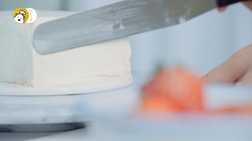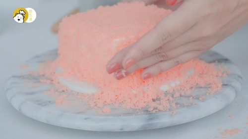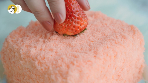 取出第一步中冷冻的剩余蛋糕体,用汤匙刮出细碎的屑屑,撒在整个蛋糕表面,侧面也要沾裹一层,最后装饰草莓即可!