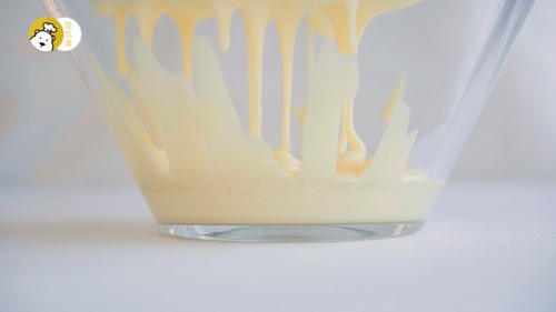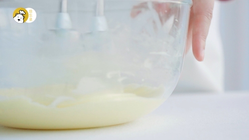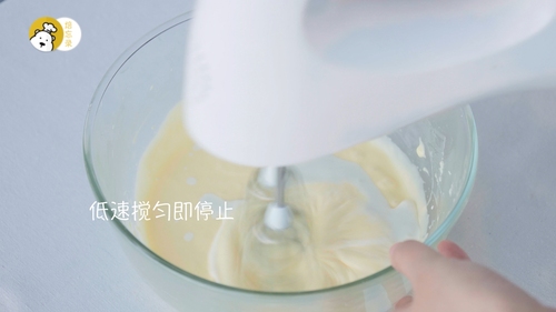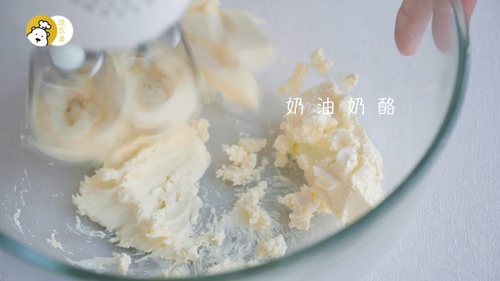 加入全蛋液,迅速搅打均匀;蛋液刚加入时,会让奶油奶酪变成一坨坨,这是正常的,搅匀即可;再加入淡奶油,搅匀即停止,别过度搅拌;