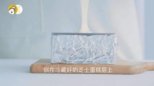 取出冷藏的芝士蛋糕,把做好的慕斯糊倒在芝士层上方,倒满为止,轻震两下去除气泡后冷藏至完全凝固;如果慕斯糊还有剩,可以密封室温保存,后面装饰用;