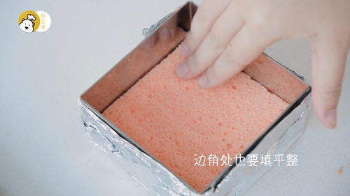 方形慕斯圈内壁涂抹一层黄油,外层包裹好锡纸备用;取一个6寸海绵蛋糕(在搜索栏内键入“海绵蛋糕”即可查询配方),分一片出来,剩余的放在冰箱冷冻,注意:是冷冻,不是冷藏;