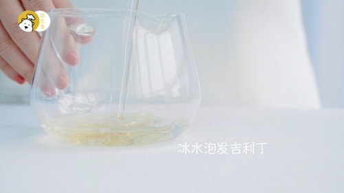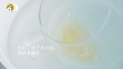 泡发好的吉利丁沥干水分,隔热水融化,倒入步骤8做好的混合液体中,边倒边搅拌哦;如果室温较低的话,再加入吉利丁液之前,可将混合液体适当做保温;