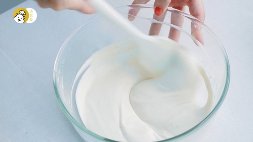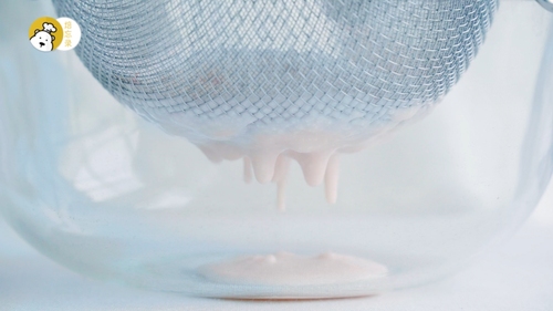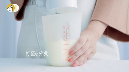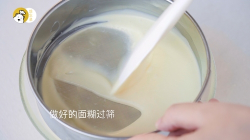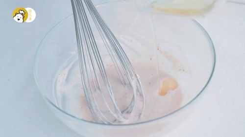 将做好的慕斯液过筛,滤掉草莓的残渣;淡奶油B打至6分发,分两次加入到慕斯液中,每次都要翻拌均匀哦;