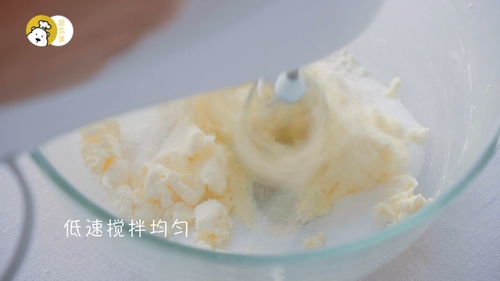 150℃预热烤箱;奶油奶酪充分软化后搅打至顺滑,加入低筋面粉与细砂糖A,搅拌均匀后停止;