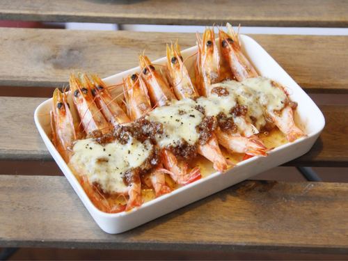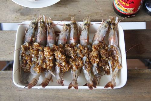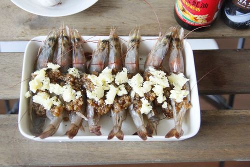 将炒好的蒜泥均匀的填满虾的后背,酱汁均匀淋上去。根据自己的喜好,将适量马苏里拉芝士均匀地铺在虾上。