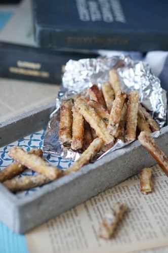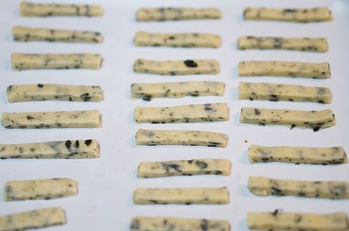 将面团擀开成约0.3-0.4mm左右厚的面皮,将面皮切成约0.5mmx4cm的细条摆在烤盘上,放入预热好的烤箱中烘烤10分钟左右,根据切的大小不同调整时间