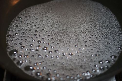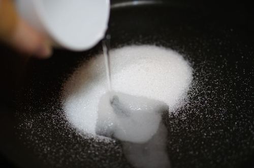 接下来制作糖浆。将糖和水倒入锅中,开小火加热到糖浆烧开