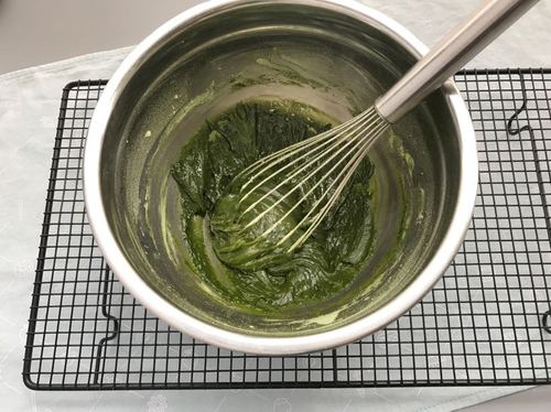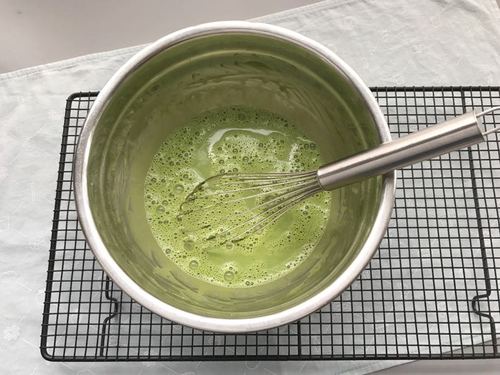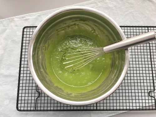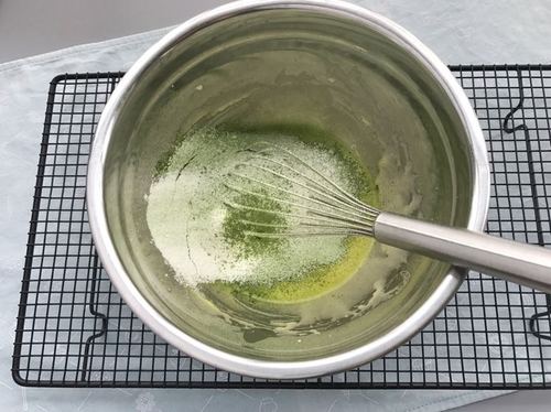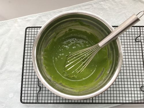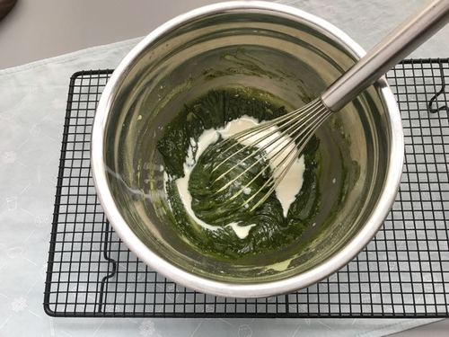 加入少量牛奶稀释面糊,然后将隔水融化的白巧克力也倒入面糊中,搅匀。白巧克力温度也要事先晾到不烫手(60度以下)哈;