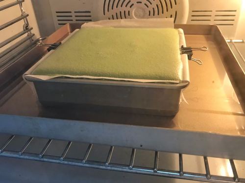 把很稀的面糊倒入垫好纸的模具中,9~10分满(对,你没看错)。然后在烤盘中下层放个较大的烤盘,注入50~60度的温水,将模具放入盘中,水浴烤35~40分钟;