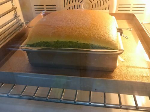 烤至蛋糕表面上色、轻推时中心略有晃动的状态就可以出炉啦!在模具中闷个15分钟,然后提着油纸将整个蛋糕拎出模具,揭开四边,晾凉。看图中,就会发现蛋糕侧面己经有分层效果了哈!