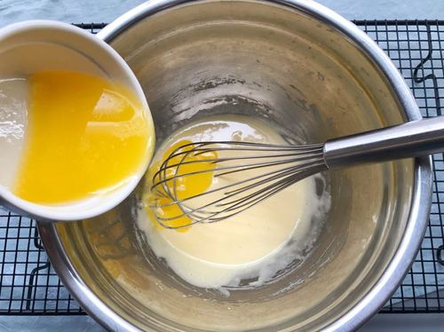 将黄油隔水融化后放到不烫手的温度,加入打白的蛋黄中,搅拌均匀;