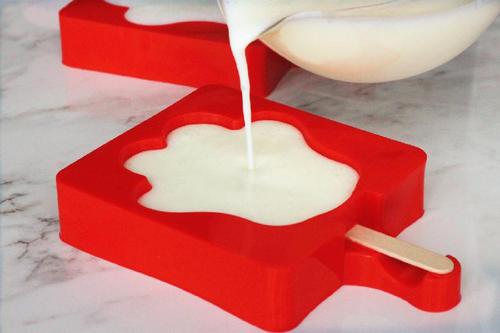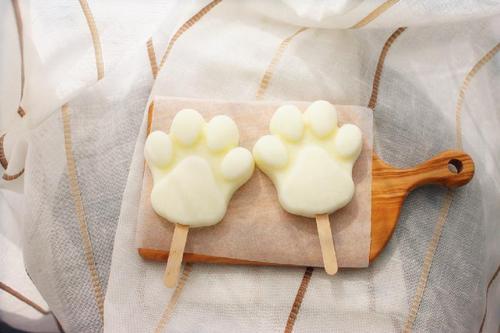 将酸奶分成两份,其中一半直接倒入2个模具中,冷冻4小时就有了白色猫爪雪糕。