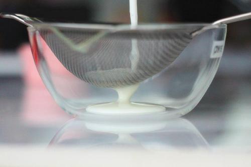 将无糖酸奶与糖粉混合,用搅拌机打匀,过筛倒入小碗中。如果用的是有糖的酸奶,这一步可以少加或者不加糖粉,建议尝着来。