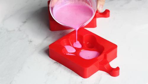 剩余的酸奶中取100g,与少量红色火龙果一起用搅拌机打匀,即是粉色酸奶。过滤后填入另外2个猫爪模具的肉垫部分,冷冻一会儿定型。注意肉垫定型的时候,白色酸奶也要放在冷藏保存哦。
