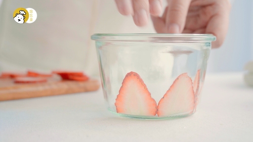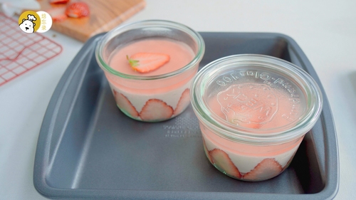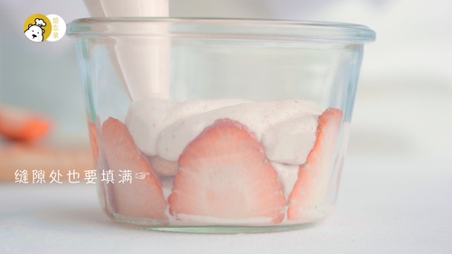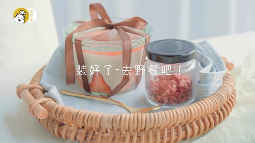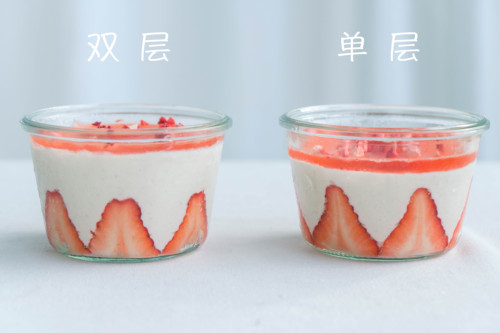 吃之前,撒一些冻干草莓粒在表面,大大挖一勺,超级满足!视频中的罐子是比较大个的,350gML,可以装填两层手指饼,相对少填一些慕斯糊即可;