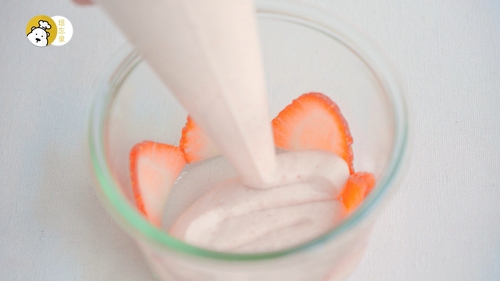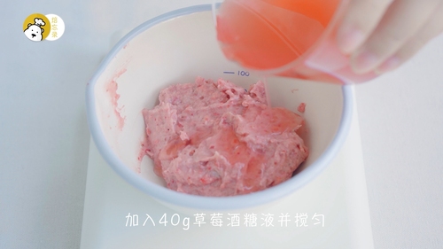 3、没有冻干草莓粉,可以用新鲜草莓代替,“草莓粉3g+酒糖液40g+细砂糖10g”整体替换为“草莓果茸40g+细砂糖25g”。