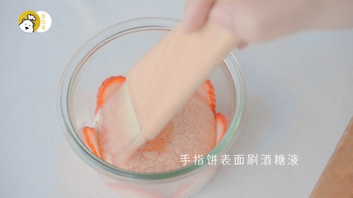 准备3-4个粉色圆形手指饼;首先制作酒糖液:混合草莓汁(草莓+纯净水打碎搅匀)、细砂糖A、朗姆酒,煮至微沸,过筛晾凉备用;