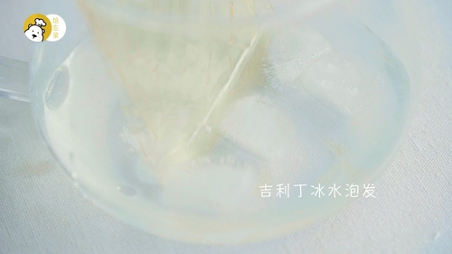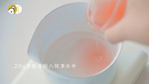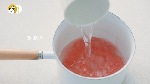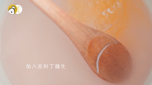 取酒糖液20g与水混合煮至变烫,加入泡发好的吉利丁片,搅拌至完全溶解;
