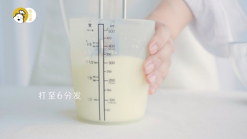 淡奶油搅打至6分发,分次与芝士糊翻拌均匀;拌好后装填进裱花袋;