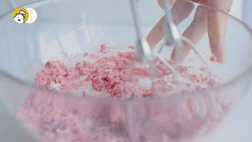 做慕斯糊:马斯卡朋隔热水搅拌,直至顺滑状;将冻干草莓粉、细砂糖B加入马斯卡朋中混合均匀;